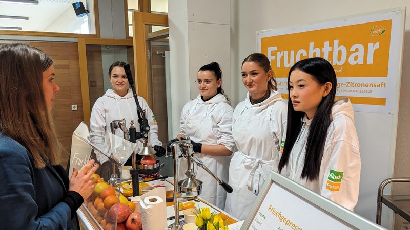 Die Saftbar der AVdual-Klassen bot frisch gepresste Säfte an, während die zwölften Klassen der Beruflichen Gymnasien eine umfangreiche Auswahl an Fingerfood bereitstellten, um für das leibliche Wohl der Besucher*innen zu sorgen.