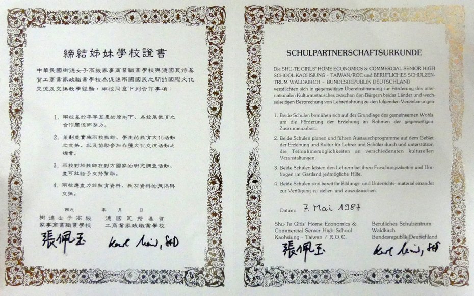 Als erste deutsche Berufsschule besiegelte das BSZ Waldkirch 1987 eine offizielle Partnerschaft mit einer nationalchinesischen Schule in Taiwan. Die berufliche Partnerschule Shu-Te befindet sich in Kaoshiung, einer Industrie- und Hafenmetropole und mit zwei Millionen Einwohnern die zweitgrößte Stadt Taiwans. Die entfernteste Partnerschule des BSZ ermöglicht einen Austausch im Bereich Berufsbildungssysteme, Wirtschaft und Kultur. Mit seinen 8.000 Schülern ist Shu-Te die zweitgrößte Schule Taiwans. Seit dem ersten Austausch 1987 kamen dank der intensiven Kontakte seit nunmehr 27 Jahren bisher 20 Schüleraustausche zustande.